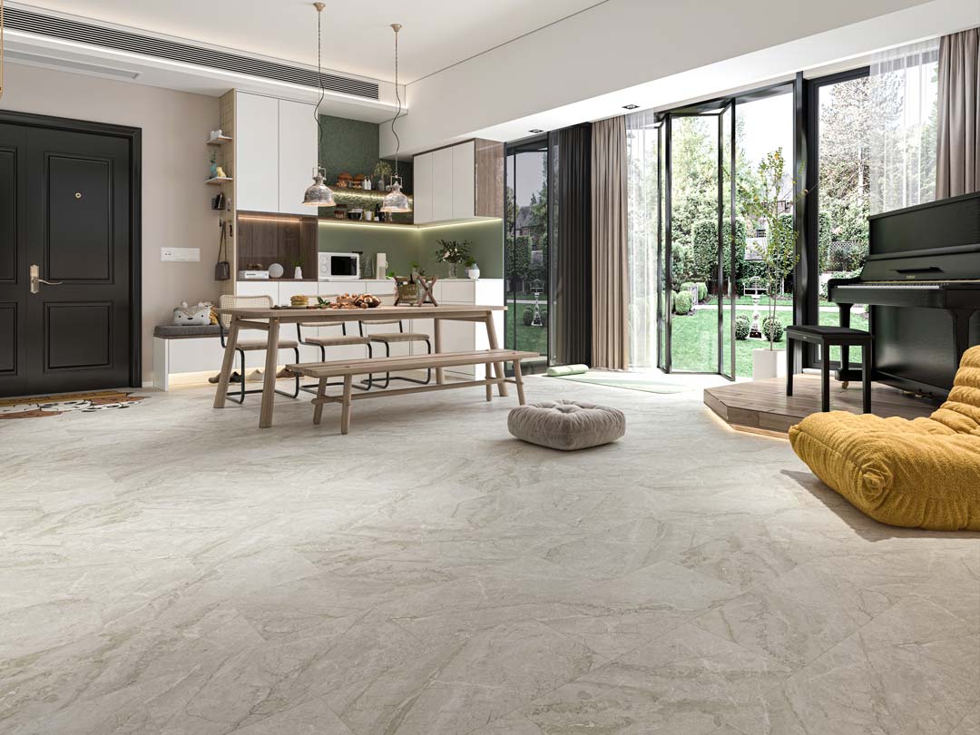 В отличие от керамогранита, кварцвинил по мраморной фактуре дает меньше звука при ходьбе, не требует сложной подрезки и не обладает высокой теплопроводностью, из-за чего пол ощущается теплее.